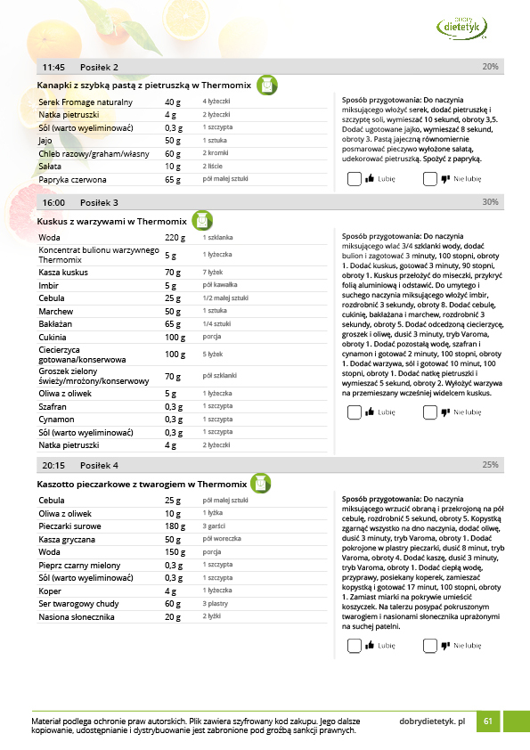 Kompleksowy 30-dniowy program redukcyjny dla mężczyzn uwzględniający w przewadze dania na THERMOMIX. Program zawiera szczegółowy, 30-dniowy jadłospis na 1800kcal uwzględniający 4 posiłki w ciągu dnia. Program realizuje potrzeby odżywcze organizmu mężczyzn a także wymagania związane z najczęściej występującymi wymaganiami zdrowotnymi (regulacja ciśnienia krwi, wspomaganie pracy serca i układu krążenia, regulacja hormonalna). W opracowaniu tej diety uwzględniono dużą ilość posiłków na Thermomix co ma ułatwić stosowanie planu żywieniowego panom posiadającym tego typu urządzenie. Dania na Thermomix zamieszczone w tym opracowaniu nie zawierają typowych przepisów jakie można znaleźć w internecie. Są to dania specjalnie opracowane lub zmodyfikowane pod kątem diety redukcyjnej. Wszystkie porcje są również podawane w przeliczeniu na jedną osobę. Stosowanie tej diety nie tylko przyczyni się do szybkich efektów w redukcji masy ciała, ale także pozwoli poznać nowe, pyszne przepisy na Thermomix.