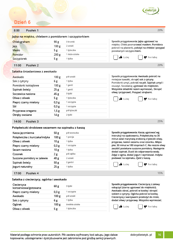 w formie propozycji posiłków (zamiast pojedynczych jadłospisów jednodniowych, przygotowano propozycje kilku propozycji dań na każdy posiłek). Tutaj nie uzależniamy Cię od tego jakie masz np. w danym dniu zjeść śniadanie czy obiad, tylko sam wybierasz sobie ulubione danie z kilku przedstawionych przez nas propozycji.