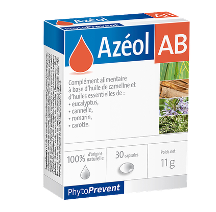 Azeol AB jest suplementem diety opracowanym na bazie oleju z lnicznika siewnego (Camelia sativa) i specjalnej kompozycji olejków eterycznych z eukaliptusa, cynamonu, rozmarynu i nasion marchwi. Zastosowany w produkcji, opatentowany proces Quality Silver, gwarantuje maksymalną jakość i trwałość oleju w okresie przydatności do spożycia.Rekomendowany do suplementacji w:
